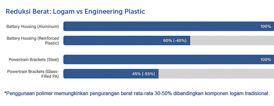 Perkembangan mobil listrik (EV) mendorong penggunaan material yang lebih ringan, tahan panas, dan memiliki isolasi listrik tinggi. Engineering plastic menjadi solusi utama karena mampu menggantikan logam dalam berbagai komponen kendaraan listrik modern.