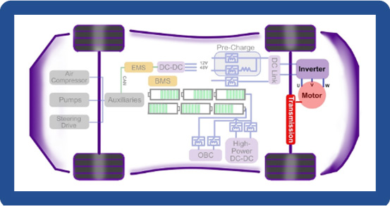 Diagram ini menggambarkan arsitektur utama mobil listrik dan penggunaan engineering plastic pada setiap sistem penting kendaraan.